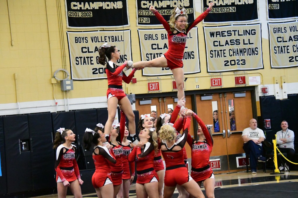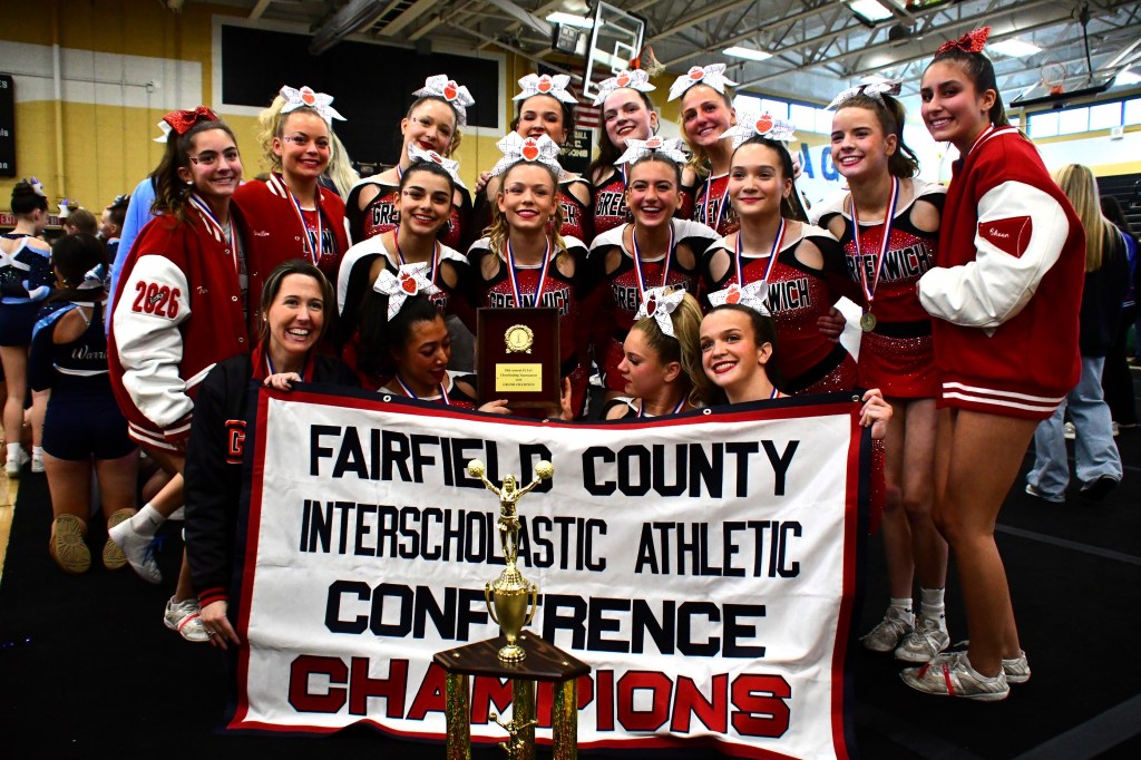 “Having been 21 years since Greenwich has taken home this title, these athletes put on an incredible performance that showcased just how hard they have been working this season,” Vyskocil said. “A staggering 4.5 points ahead of their nearest competitor, a team who had won the past 8 years in a row (Danbury) the Greenwich Varsity Cheerleaders scored a 96.15 out of 100; securing the FCIAC Grand Championship title, which is awarded to the highest scoring team at the competition. This is the first time in Greenwich High School history that they won this honor.”