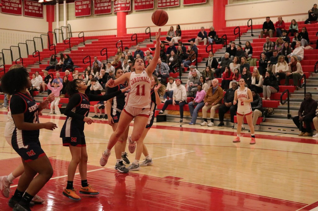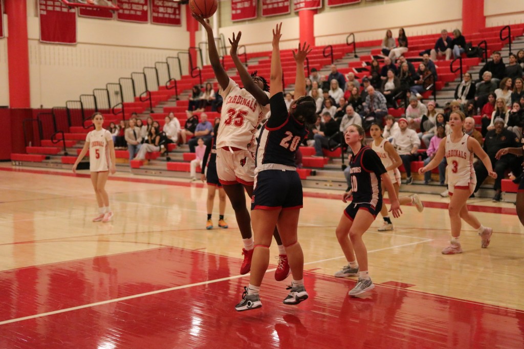 Photo by Dan Utzinger: Cardinals senior power forward/captain Kate Baxendale goes up for a shot in the lane vs. McMahon.