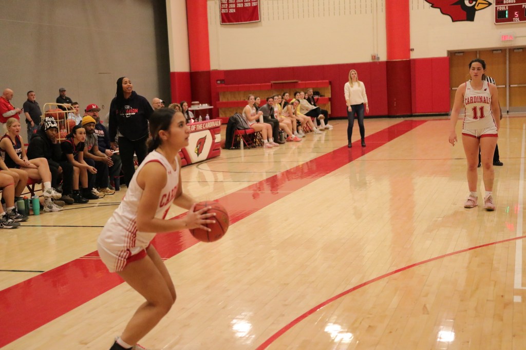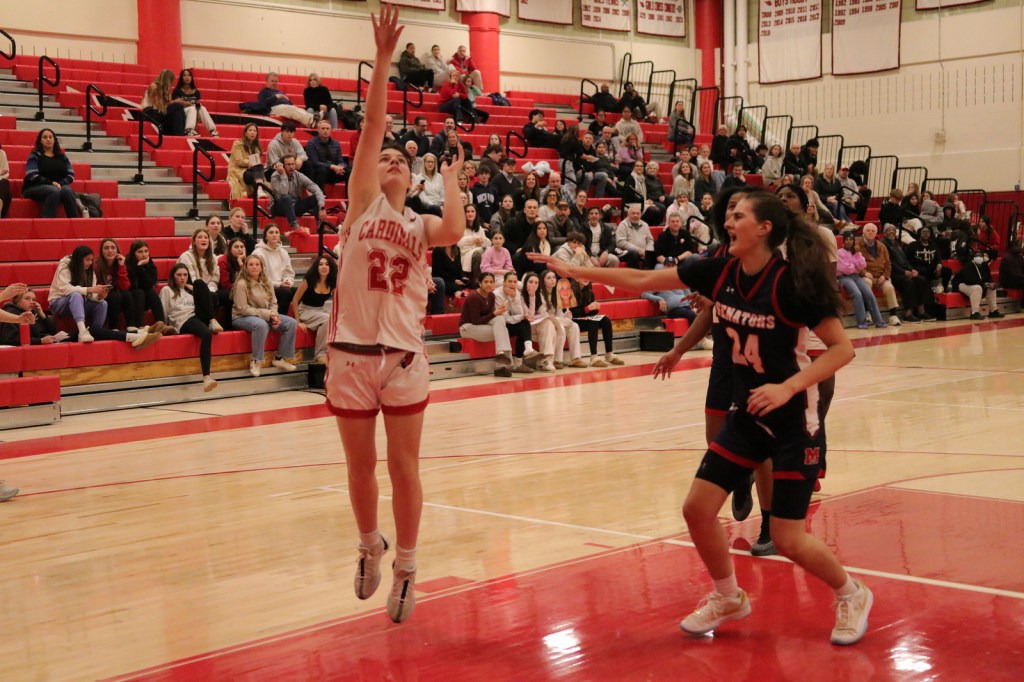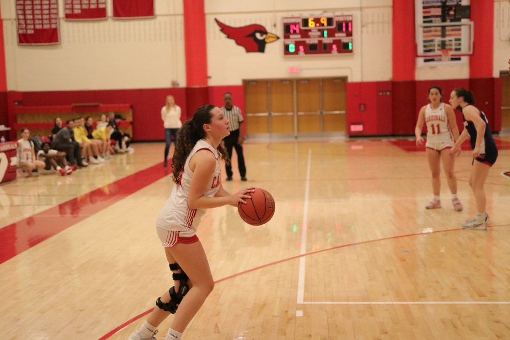 Photo provided by Dan Utzinger: Mikayla Kiernan, a junior guard/forward, gets ready to take a 3-point shot for the Cardinals during the home victory against Brien McMahon High School.