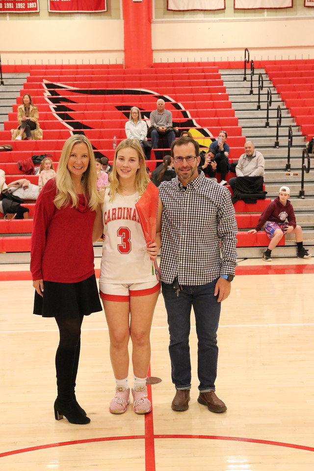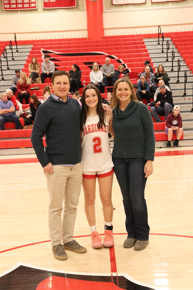 Photo by Dan Utzinger: Greenwich High School senior captain Kate Baxendale is joined by her family during Senior Night for the Cardinals varsity girls basketball team.