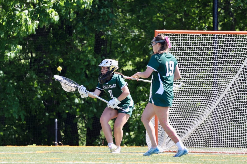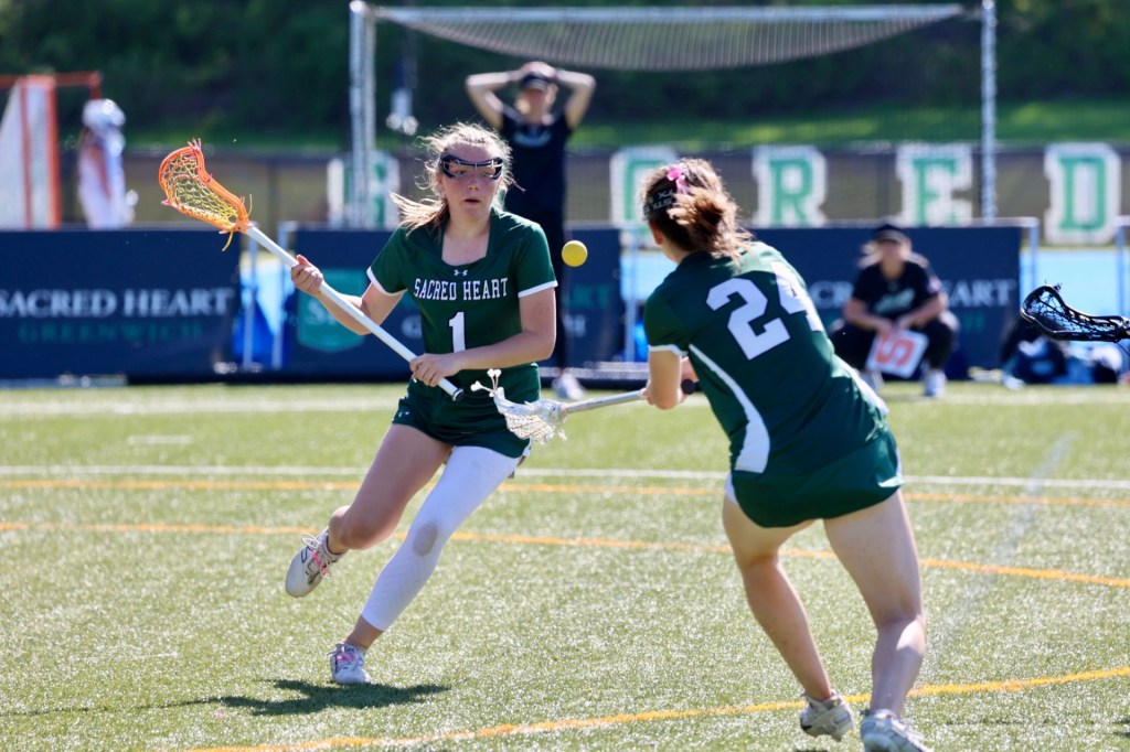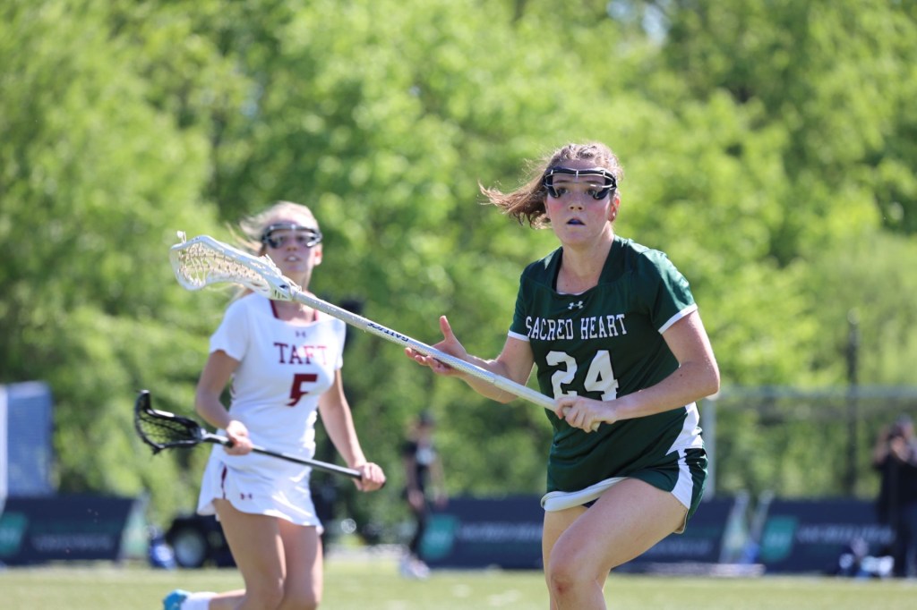 Photo by Tara Shea Bacigalupo: Senior Daphne Fallon (No. 24) and Peyla Carcaterra (No. 1) go after the ball during Sacred Heart’s 16-4 lacrosse win at home against The Taft School on May 10, 2025.