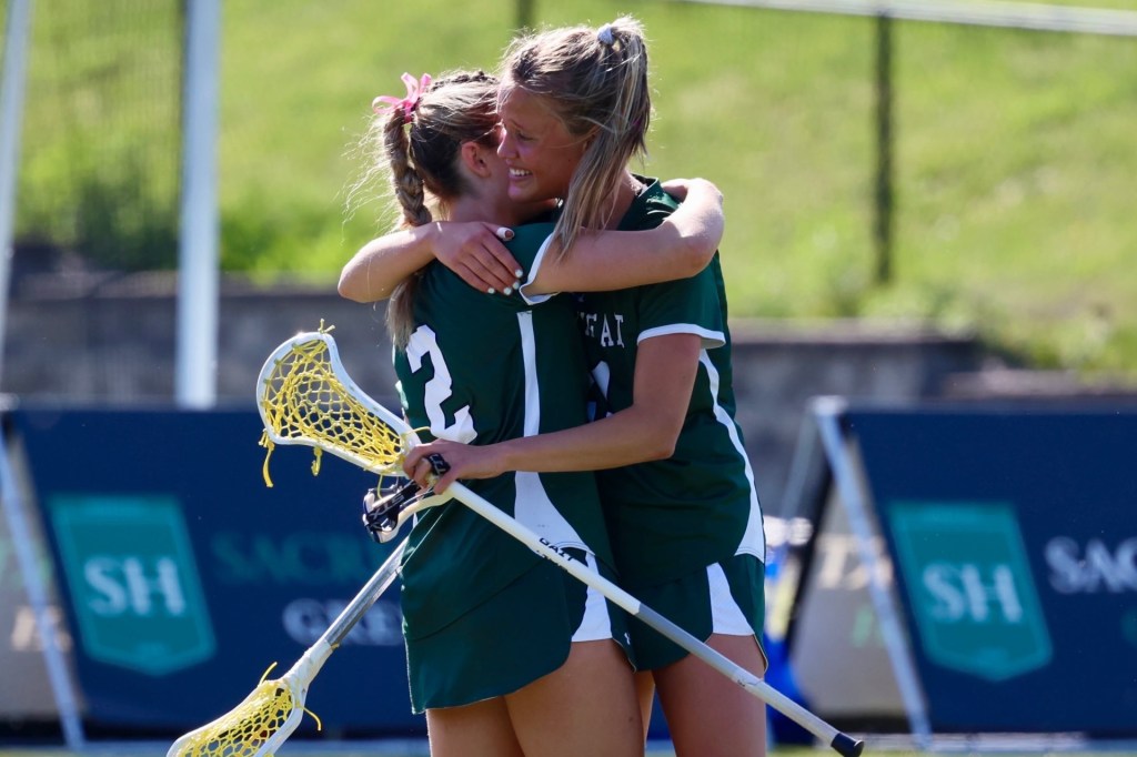 Photo by Tara Shea Bacigalupo: Morgan Sfreddo, right, was one of the seniors honored by Sacred Heart Greenwich’s Varsity A lacrosse team on Senior Day on May 10, 2025. Sacred Heart was victorious vs. The Taft School, 16-4.