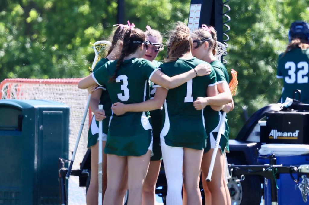 Photo by Tara Shea Bacigalupo: The Sacred Heart Greenwich Varsity A lacrosse team gather on their home field after defeating The Taft School, 16-4, on May 10, 2025, The Tigers celebrated Senior Day as well.