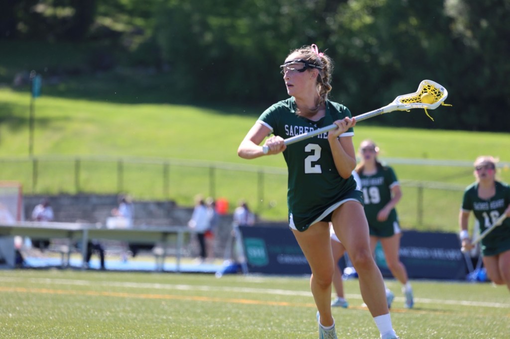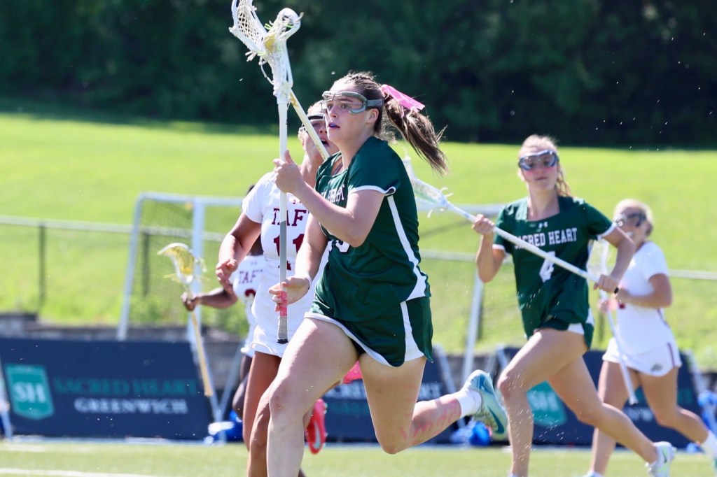 Photo by Tara Shea Bacigalupo: Daphne Fallon in action for Sacred Heart Greenwich’s Varsity A lacrosse team during the Tigers’ 16-4 home win over Taft on May 10, 2025. Fallon was one of the seniors honored on Senior Day.
