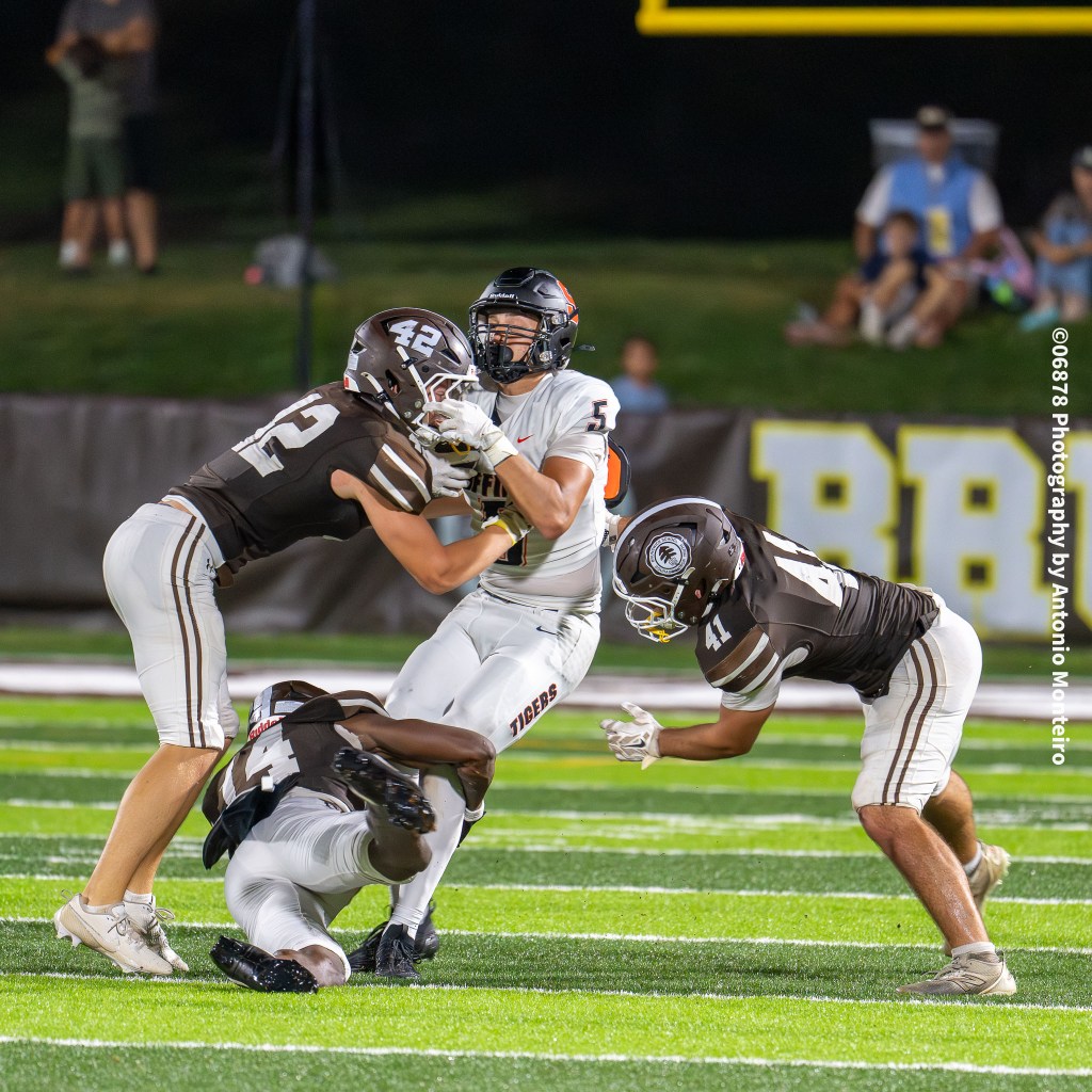 The Tigers (1-2) broke a long play of their own for their opening touchdown of the game. Sophomore quarterback Drew Catterton completed a short pass near the left sideline to senior running back/receiver Bryce Summers. After snaring the pass, Summers broke a tackle and sprinted down the left sideline, showing standout speed, for an 80-yard touchdown, making it a 14-7 game. That didn’t conclude the scoring in this electrifying second quarter, however.