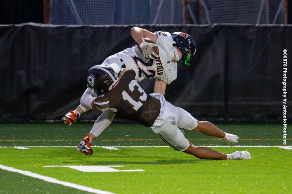 Indeed, as the statistics indicate, it didn’t take the Bruins long to impose their will offensively on Suffield Academy. The Bruins reached the end zone again on their second possession. Rolapp dropped back to pass and again connected with Park over the middle. Using his elusiveness and speed, Park caught the pass and ran 22 yards to the end zone. The PAT was converted and ‘Wick held a quick 14-0 lead at the 6:13 mark of the first quarter.