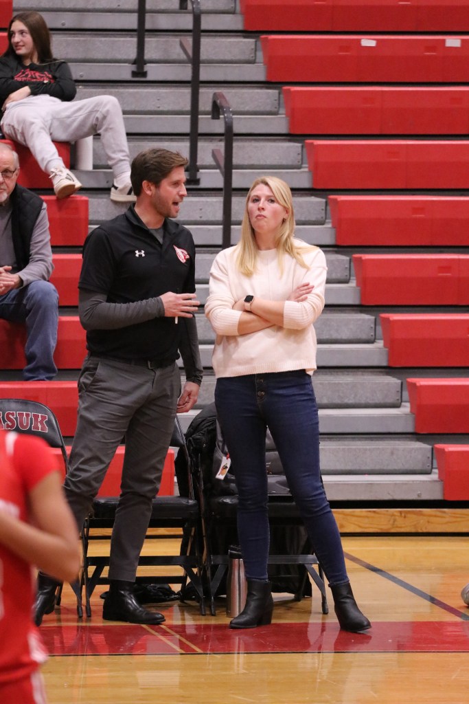 Photo provided by Dan Utzinger: Greenwich High School varsity girls basketball head coach Megan Wax, right, talks to assistant coach Dave Reetz during the Cardinals’ game on the road recently against Masuk High School. The Cardinals were victorious, 65-31.