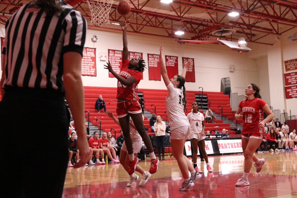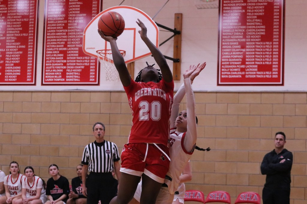 Photo courtesy of Dan Utzinger: Greenwich High School sophomore center Zuri Faison goes in for a shot from the low post during a road game against Sacred Heart Academy on December 19th, 2025.