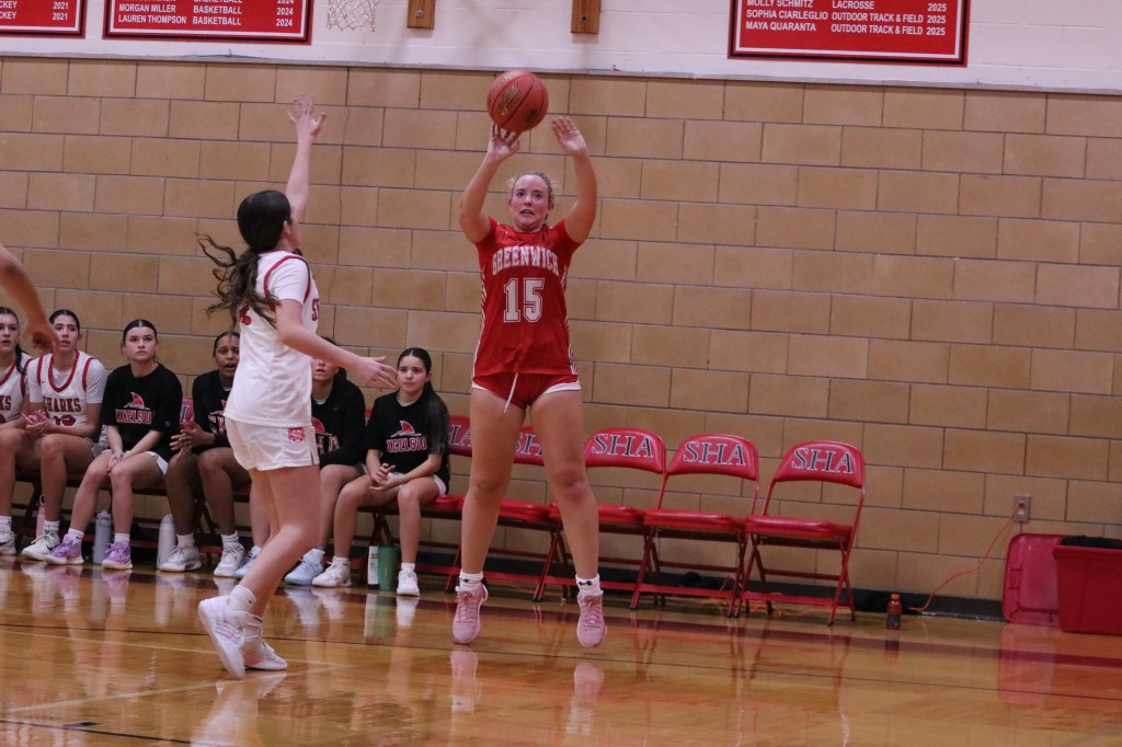 Photo by Dan Utzinger: Juliette Pelham of Greenwich takes a jumper during the team’s road defeat vs. SHA.