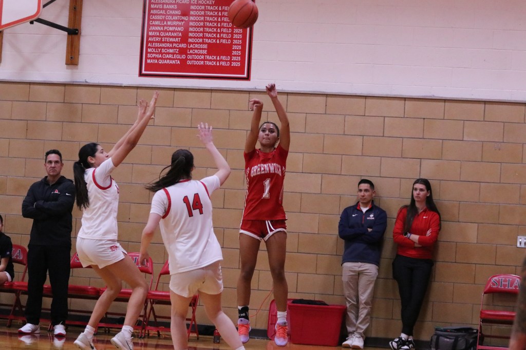 Photo by Dan Utzinger: Greenwich High School senior Maddie Young takes a 3-pointer versus Sacred Heart Academy.