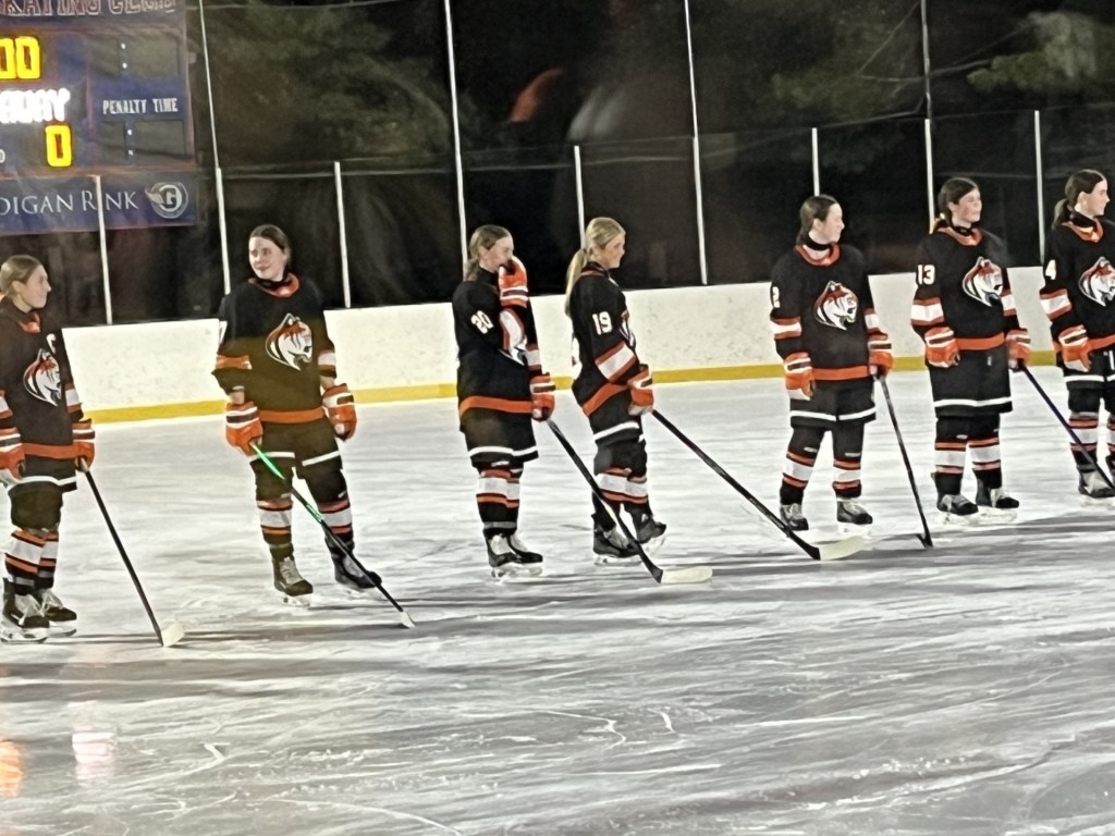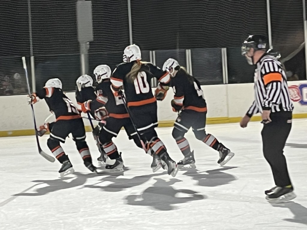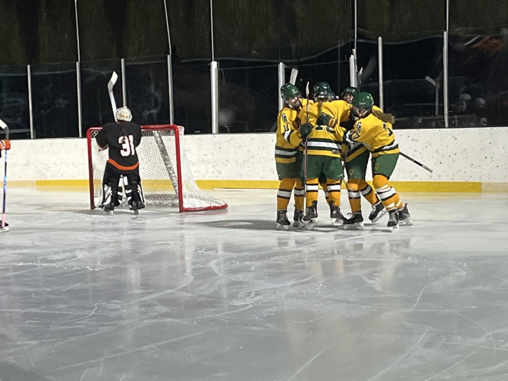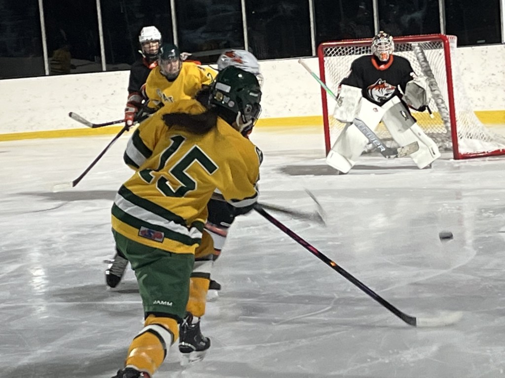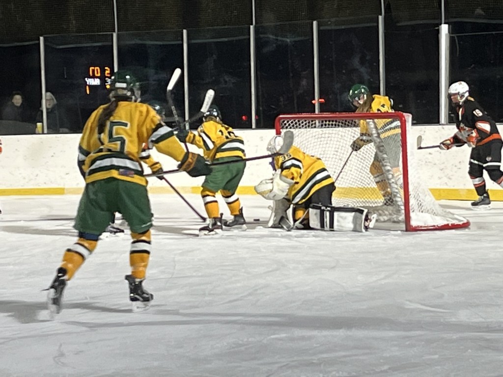 “Marguerite, she’s in eighth grade and she doesn’t have a lot of experience under her belt yet, but she is standing tall for us,” Brawley said. “She’s a happy kid that is happy to be there in the net and the girls love her, they rally around her. She was making great saves back-and-forth and I think that helps feed us. It makes us feel better when we’re out on the ice.”