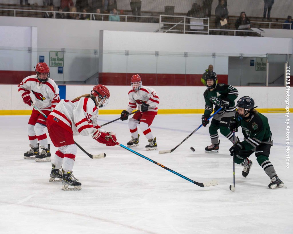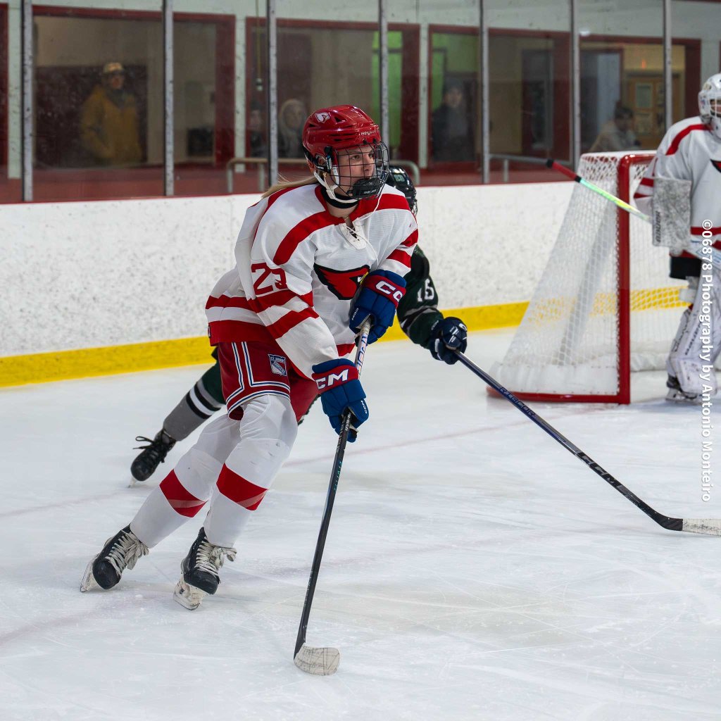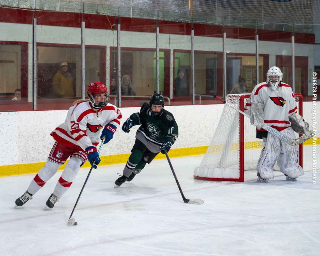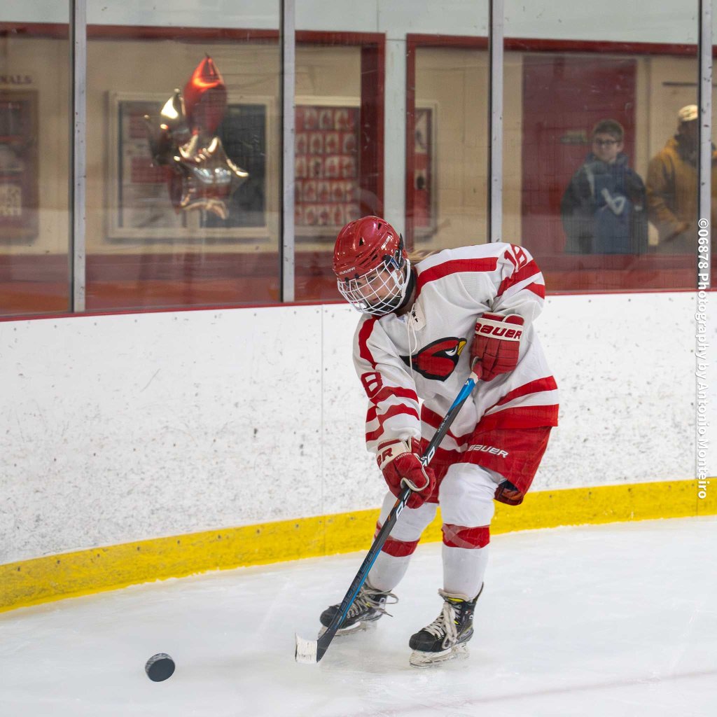 06878 Photography by Antonio Monteiro: Maddy Weiner of the Cardinals retrieves the puck along the boards against Guilford. In goal for the Cardinals is Eleanor Woolven. Greenwich was edged by Guilford, 3-2.