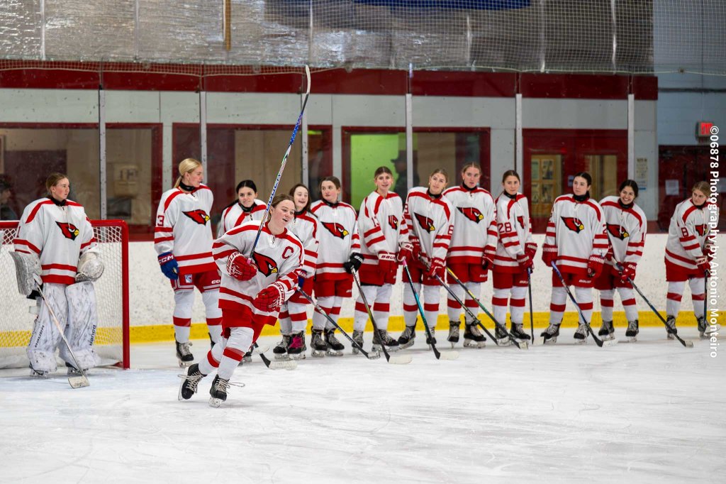 06878 Photography by Antonio Monteiro: Greenwich High captain Allie Studwell during pregame introduction at the Cardinals’ Senior Night game against Guilford High School on Feb. 12, 2026, at Dorothy Hamill Skating Rink.