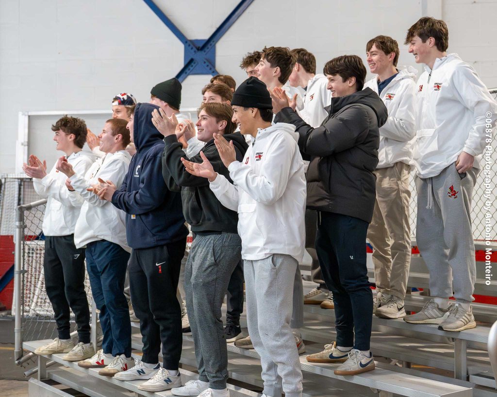 Photo by Antonio Monteiro/06878 Photography: Members of Greenwich High School’s varsity boys ice hockey team cheer on the GHS girls varsity ice hockey team during its Senior Night game against Guilford at Dorothy Hamill Skating Rink.