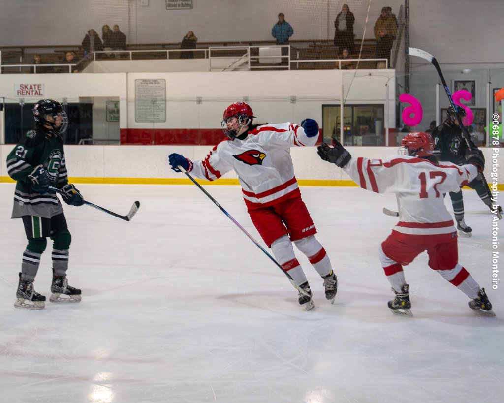 Cardinals sophomore goalie Eleanor Woolven kept the score 1-1 with several nifty saves toward the end of the first period. In the second period, Binkowski scored her second goal of the night, putting the visitors on top, 2-1, with 2:55 to go in the frame.