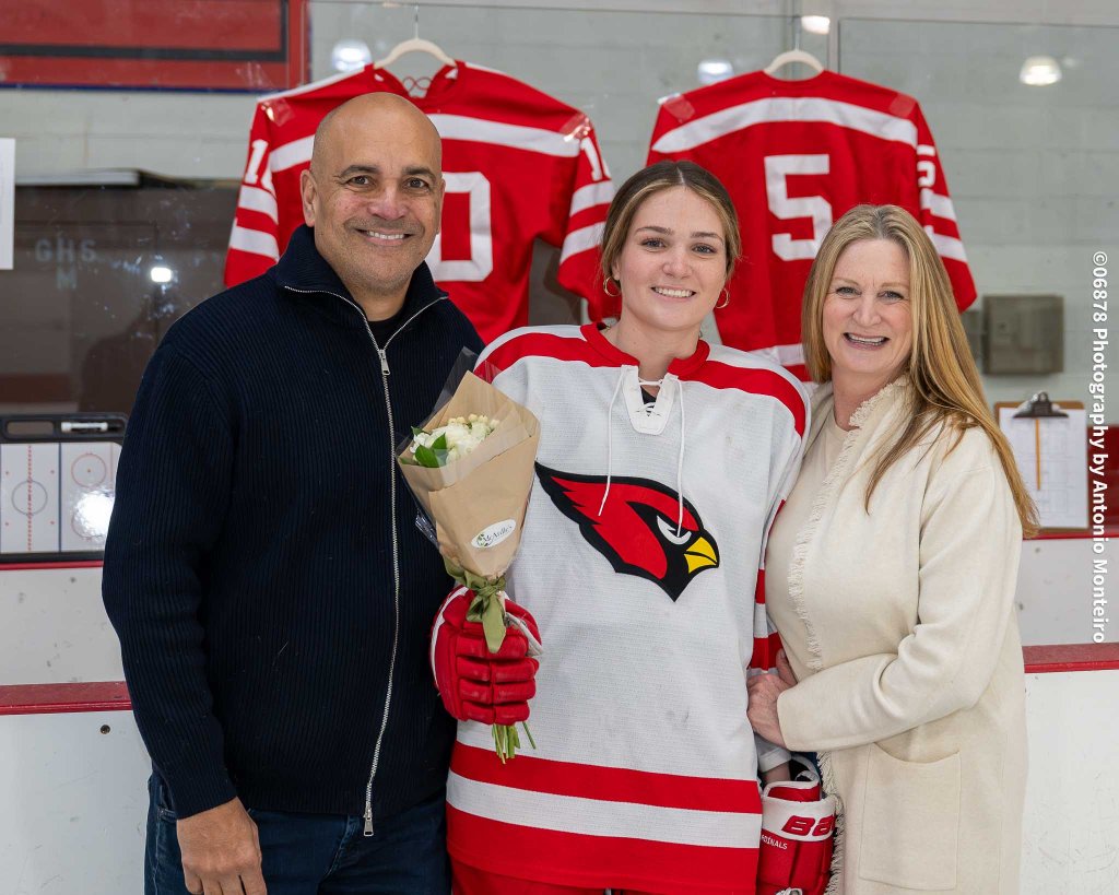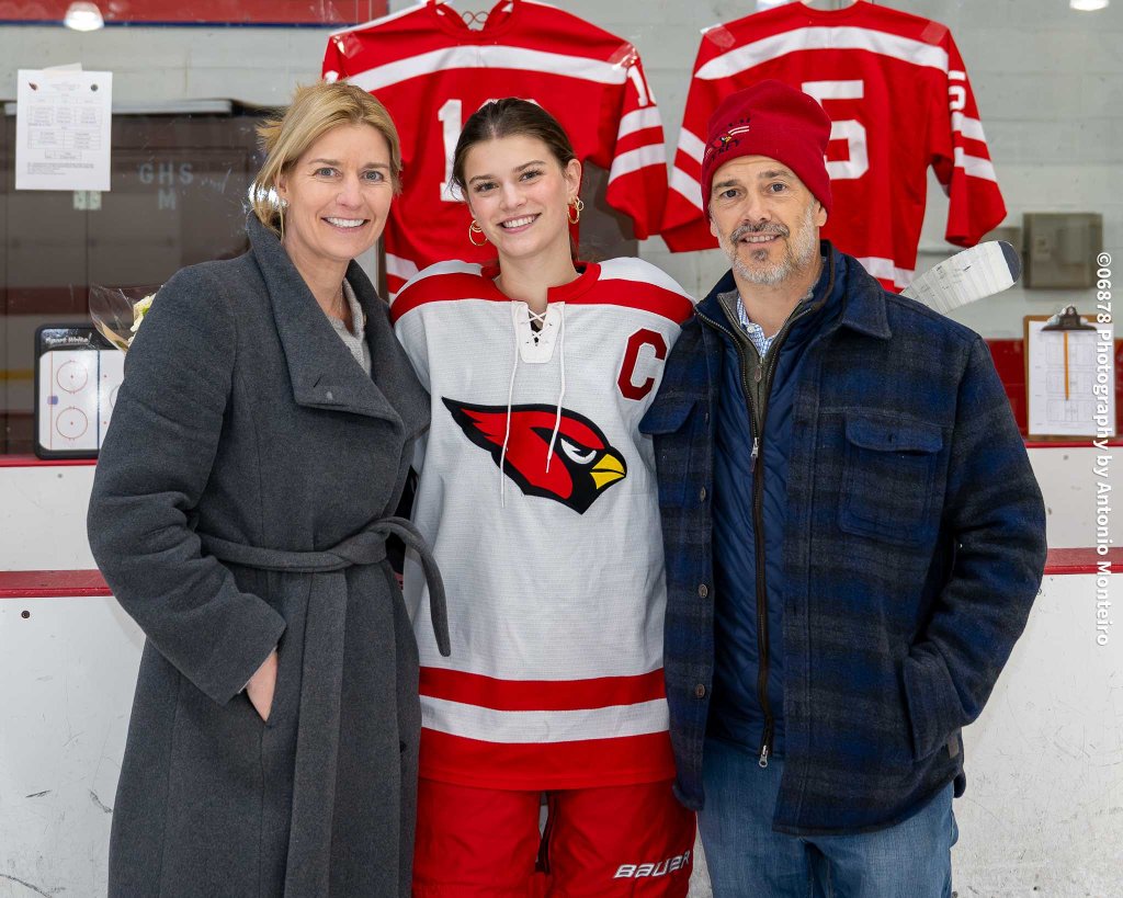 Photo by Antonio Monteiro/06878 Photography: Greenwich High School senior captain Allie Studwell and her family at Senior Night on Feb. 12, 2026, at Dorothy Hamill Skating Rink in Greenwich.