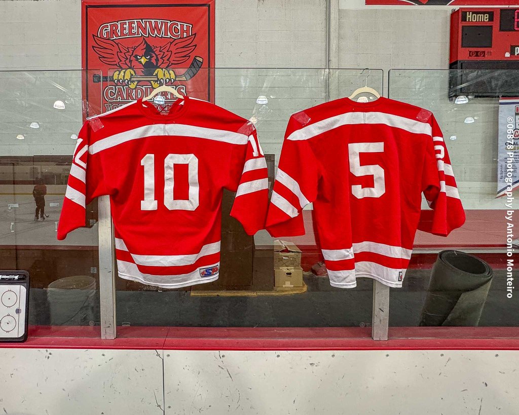 Photo by Antonio Monteiro/06878 Photography: The jerseys of seniors Allie Studwell (No. 10) and Tate Patterson (No. 5), Greenwich’s seniors, on display on Senior Night.