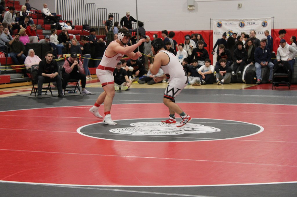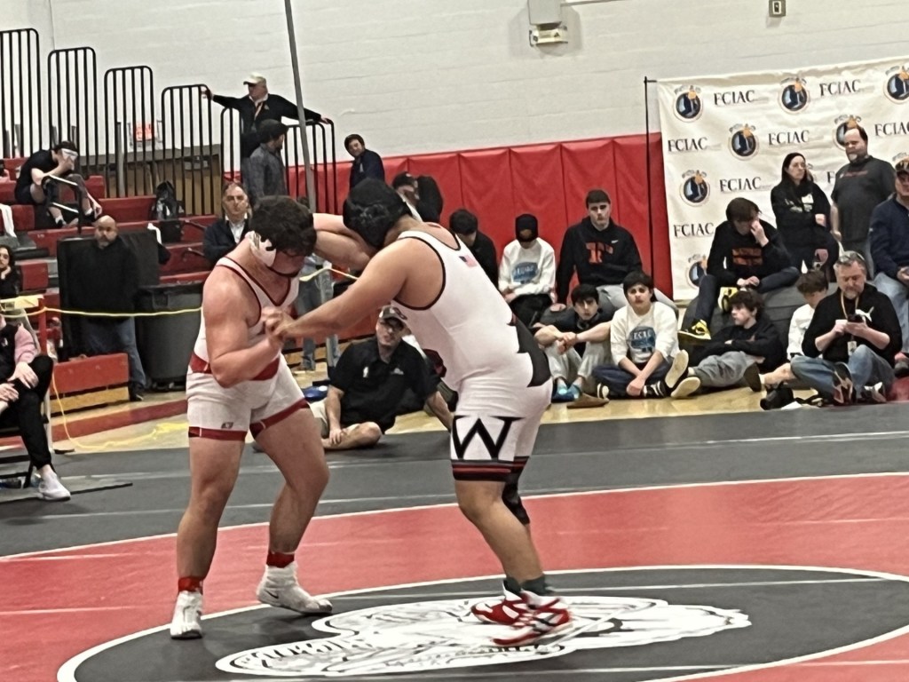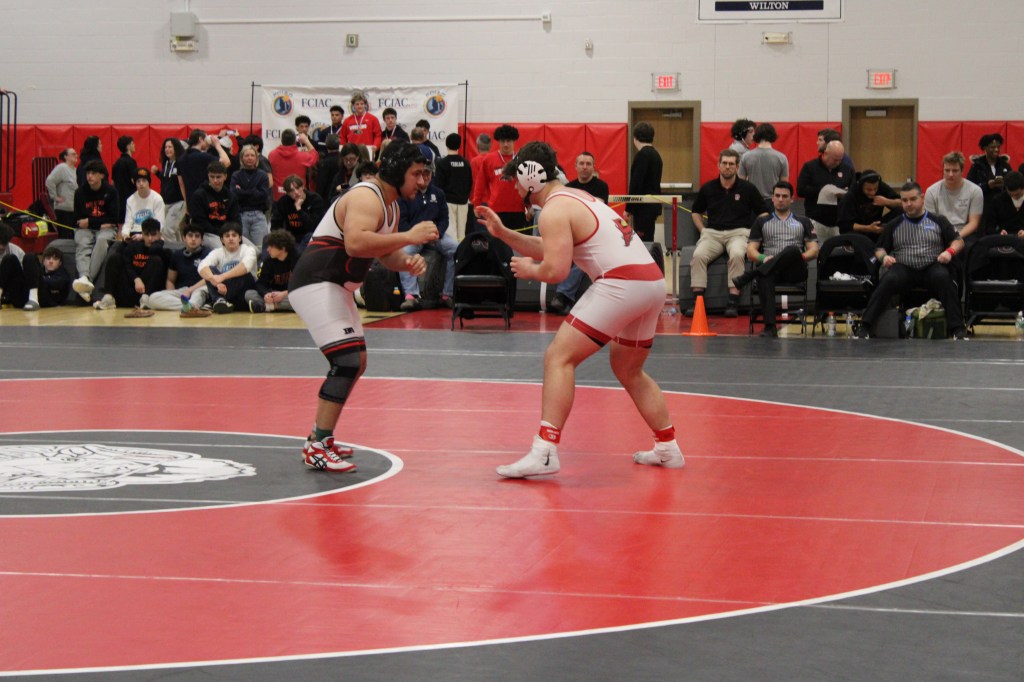 In one of the most exciting and hard-fought matches of the Joe Sikorski FCIAC Wrestling Tournament at New Canaan High School on Feb. 14, Falla won the 285-pound weight class championship, edging Fairfield Warde senior Jose Abreau Barillas in the title match. All eyes were on the heavyweight match at the FCIAC Tournament, which saw Falla defeat Abreau Barillas in an ultimate tiebreaker, following three overtime periods.