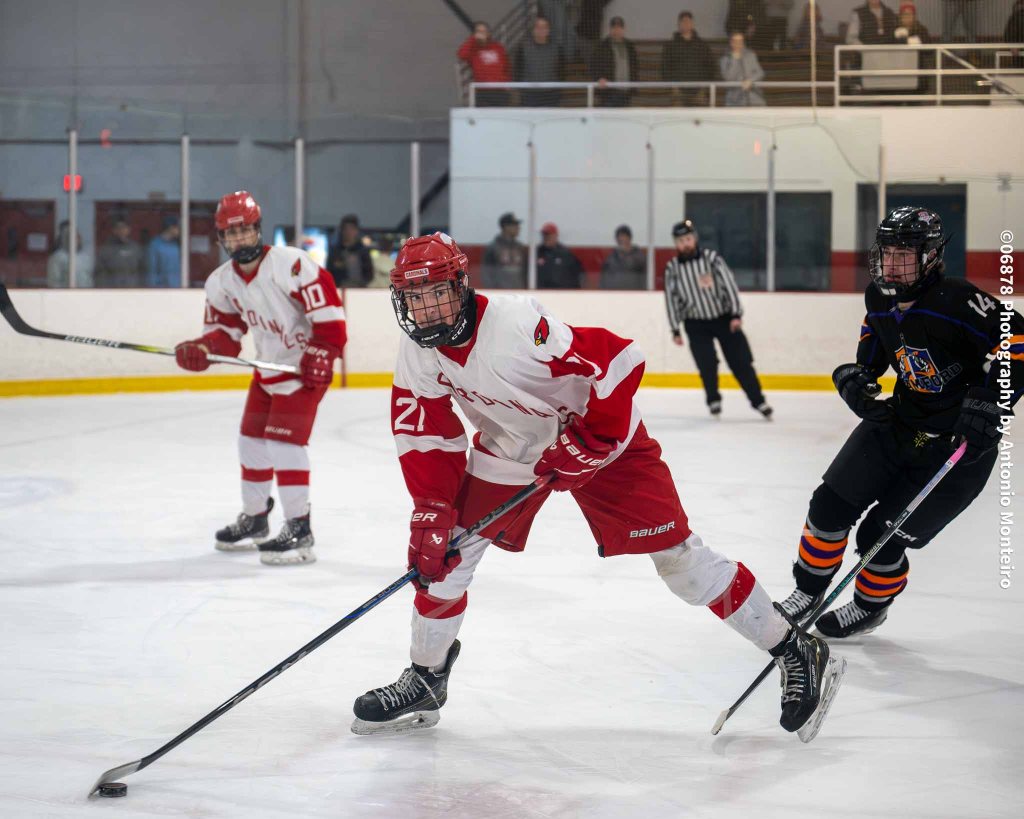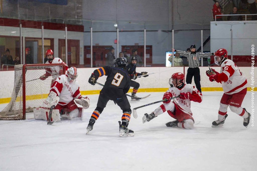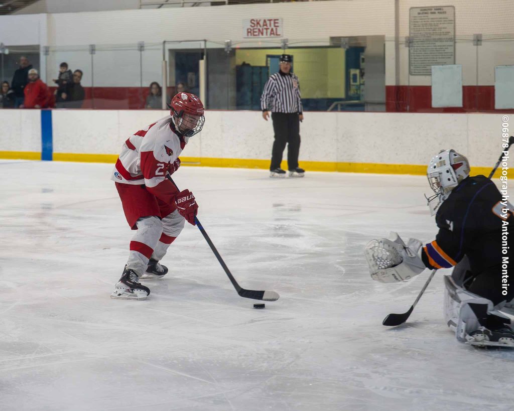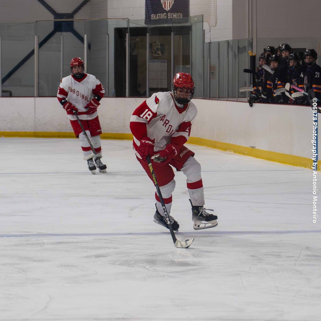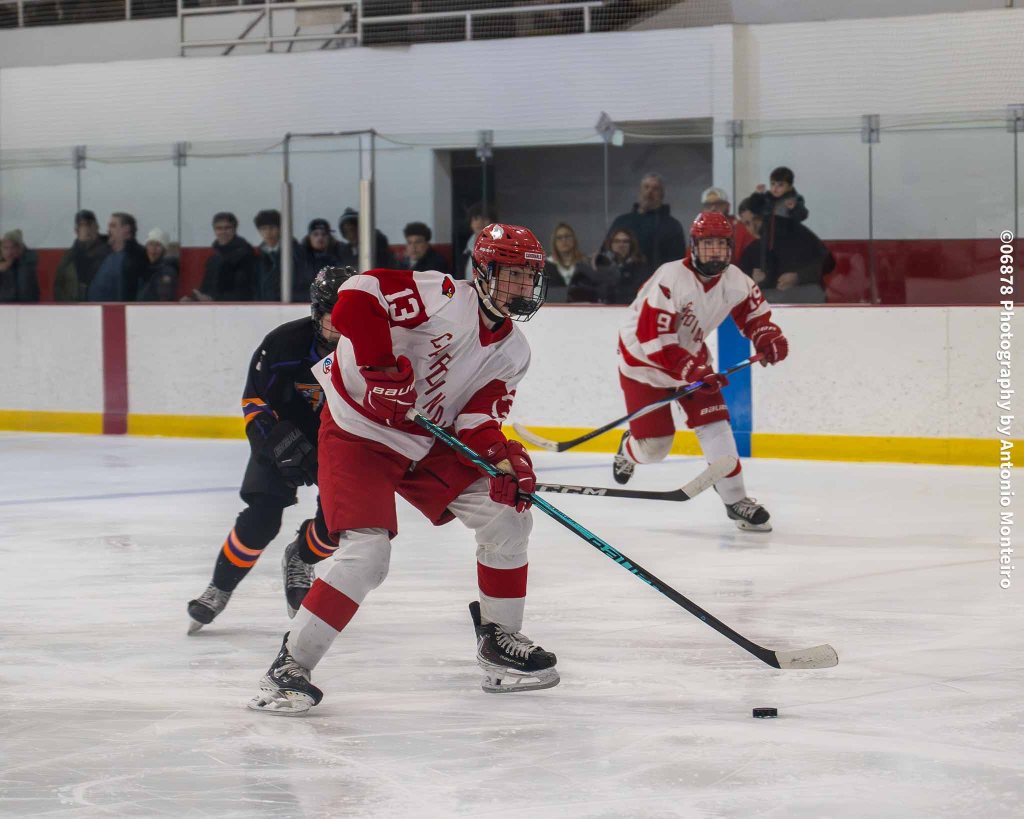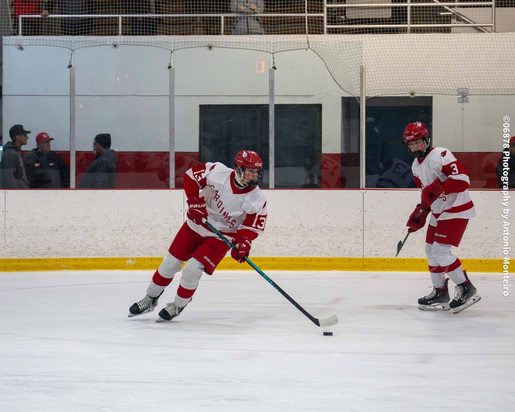 The Cardinals closed to within 3-2 at the 5:40 mark of the second period. Junior Thomas Lanzarone tallied off a one-timer with sophomore Aidan Murray and senior William Flatow each assisting on the goal, cutting Stamford/Westhill’s edge to 3-2.