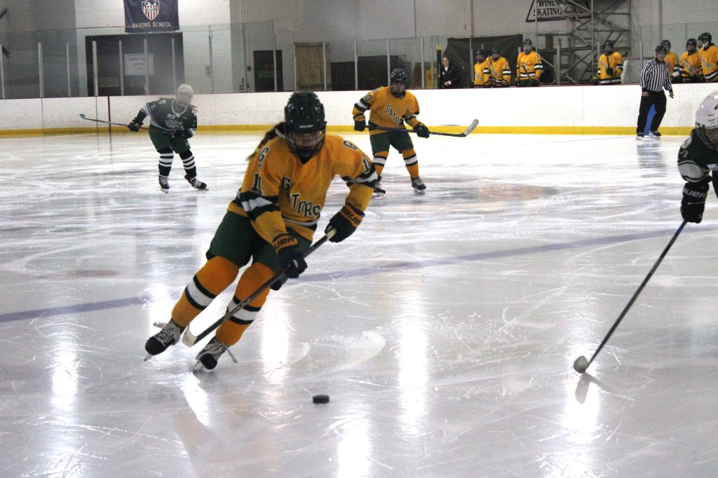 Then came Sacred Heart’s scoring spurt. Camilla Caffray got the Tigers on the scoreboard, creating a goal with 8:47 remaining in the second period off assists from Audrey Dyer and Caroline O’Neill. Just 1:18 later SHG scored again, then with 6:15 to go in the second stanza, Michaela O’Brien got the puck past GA goalie Marguerite Triggiani, cutting GA’s advantage to 4-3.