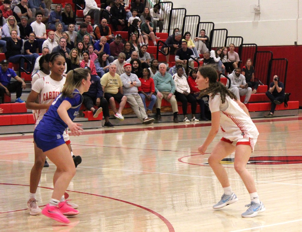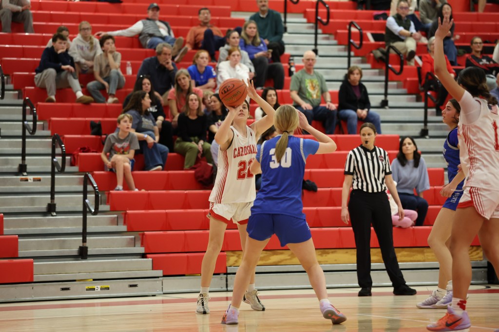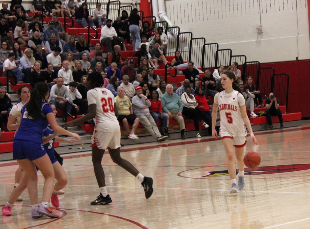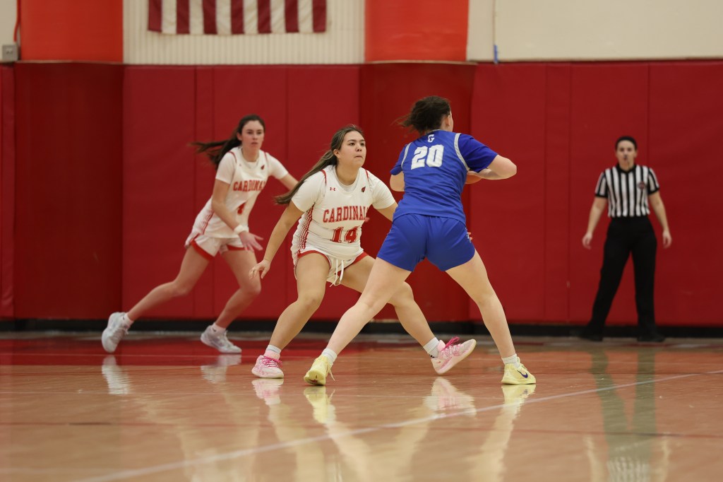 The host Cardinals began pulling away from the Guardians late in the first quarter. A layup by senior guard/captain Juliette Pelham and a jumper from the corner, gave the Cards a 15-9 lead. Utzinger made a fastbreak layup and Kiernan swished a 3-pointer from the right corner, making it 20-9 in favor of the home team after the first quarter of action.